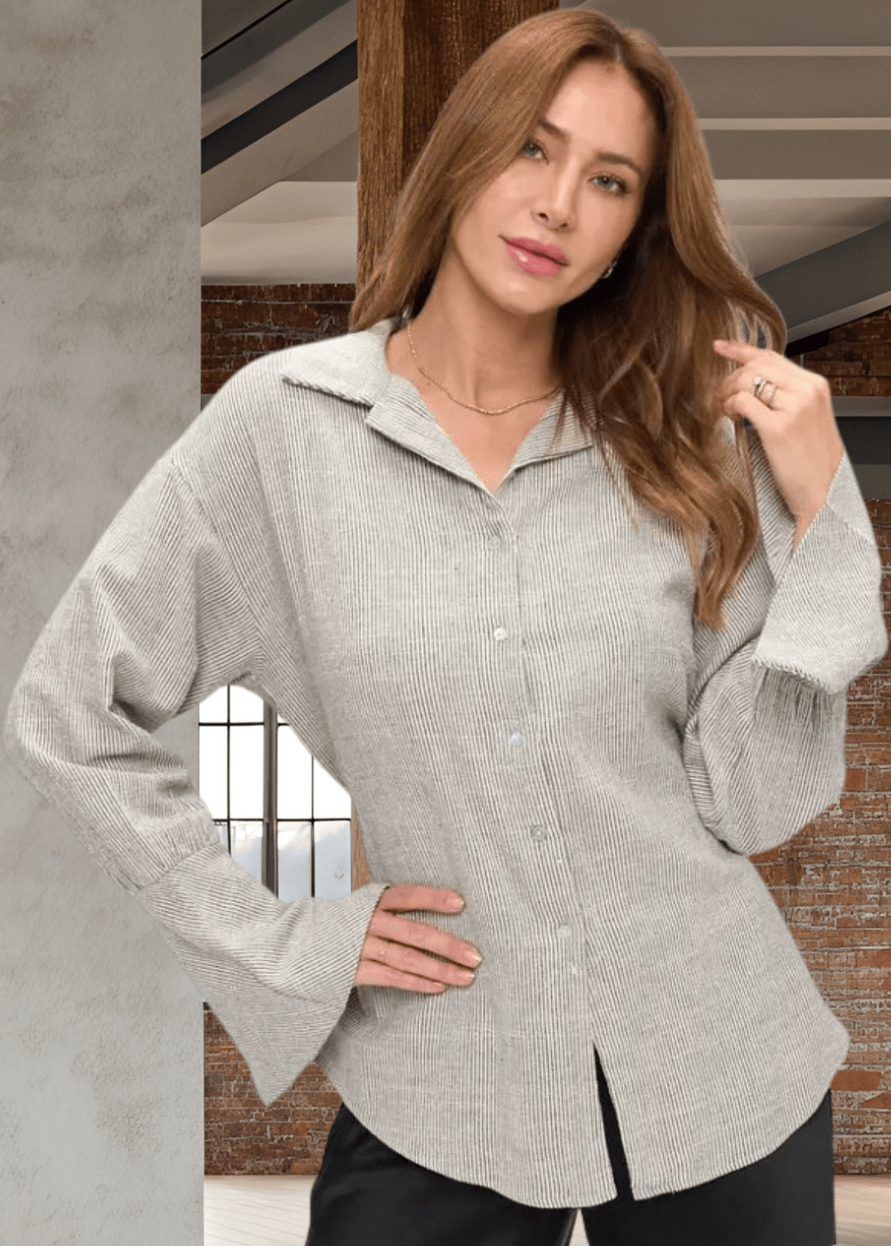 Elevate your wardrobe with the Made in USA Gabriella Cuff Detail Striped Top, featuring a classic collared design and long sleeves with stylish split bell cuffs. The tie-back detail adds a modern twist, while the subtle charcoal pinstripes on ivory make for a versatile, sophisticated look. Crafted from a breathable blend of cotton, rayon, and linen, this top offers all-day comfort and easy care with machine washable fabric.