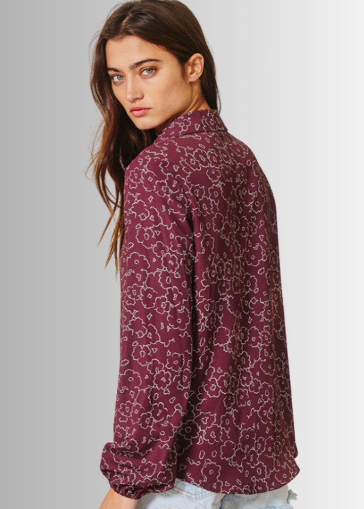 This raisin-colored floral print blouse features a classic collar, button-down front, and long sleeves for a timeless look. Designed with a relaxed fit and curved hem, it offers lightweight comfort and a true-to-size fit. Perfect for spring and fall, this non-stretch blouse is a versatile, dressy option made in the USA. Ideal for women seeking stylish, all-season apparel that blends elegance with everyday ease.