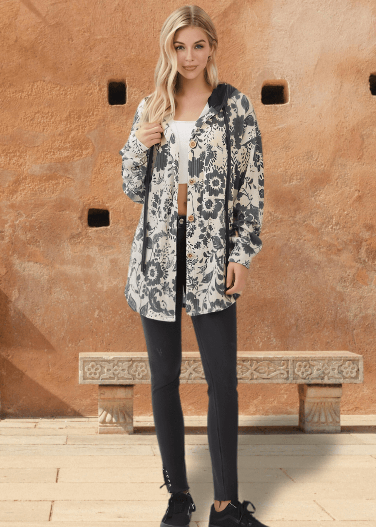 Elevate your layering game with the Elise Floral Ribbed Knit Shacket—a versatile piece that seamlessly transitions from season to season. Crafted from a soft ribbed knit in a striking allover floral pattern, this shacket combines comfort with contemporary style. The contrast drawstring hood and front button closure add functional charm, while the relaxed silhouette flatters every frame. Whether you're layering on cool mornings or reaching for extra warmth on breezy evenings, this lightweight essential delivers cozy sophistication. Made in the USA from a premium polyester-spandex blend, it's the elevated staple your wardrobe has been waiting for.