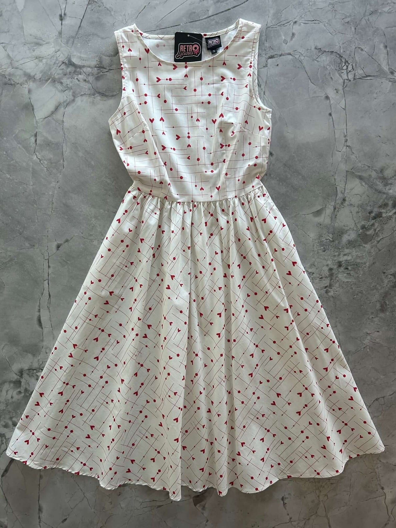 A vintage style piece with fun, modern details; our midi dress is now available in our Be Mine print. Made from 100% cotton, this classic 1950's inspired dress features a high neckline, longer length swing skirt with hidden side pockets, and back zippered closure.