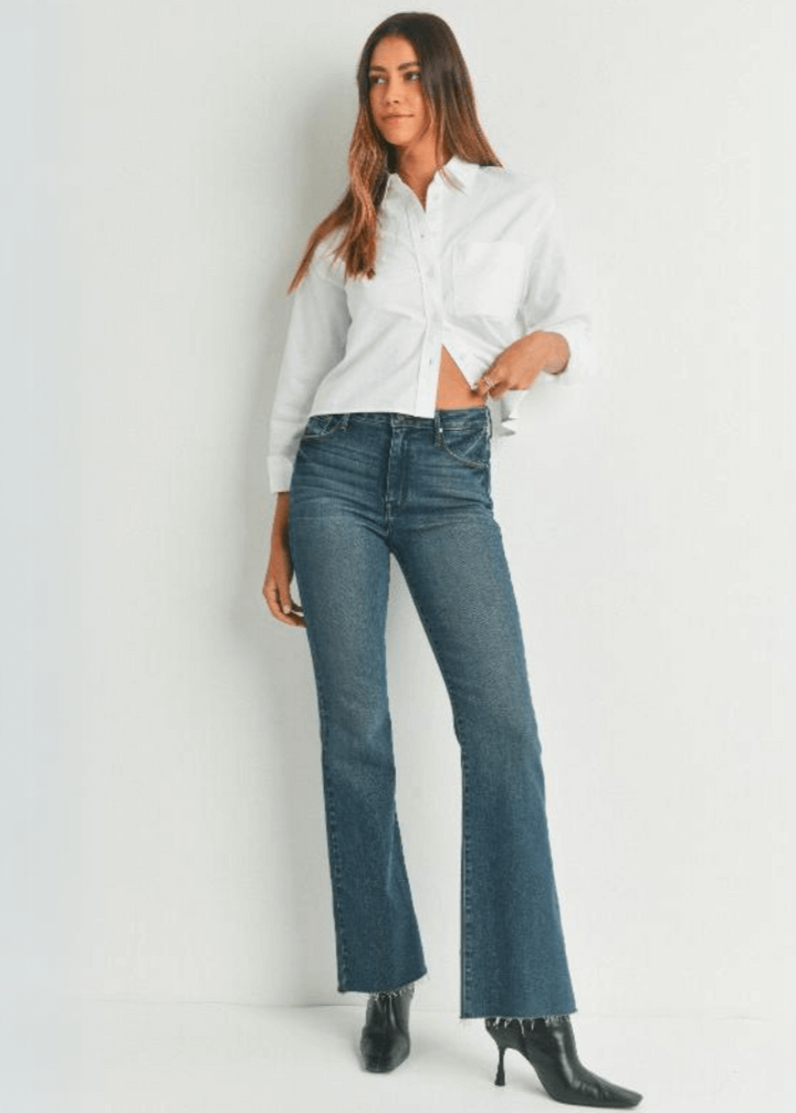 Introducing the Fall Flare Denim Jeans—fitted, flattering, and flexible. Super-soft cotton-blend fabric ensures extra comfort, while a scissor-cut hem and flare leg adds a stylish touch. Get the perfect fit with just the right amount of stretch for all your everyday activities. Ready to instantly elevate your wardrobe? You can have any inseam you desire, if you can cut a straight line. These are so simple to alter. Just cut to your desired inseam and use tweezers to fray to your liking. We took this classic silhouette, and gave it an updated wash and scissor cut hem to make it the ultimate jean for dressing up and dressing down.