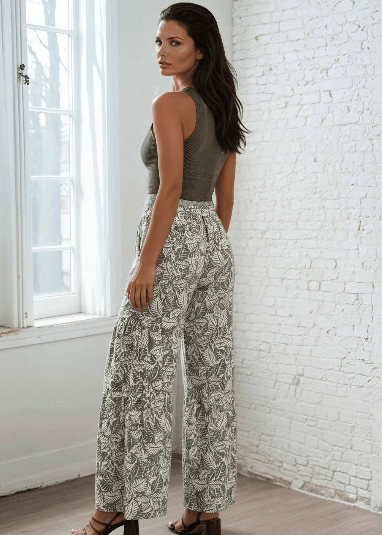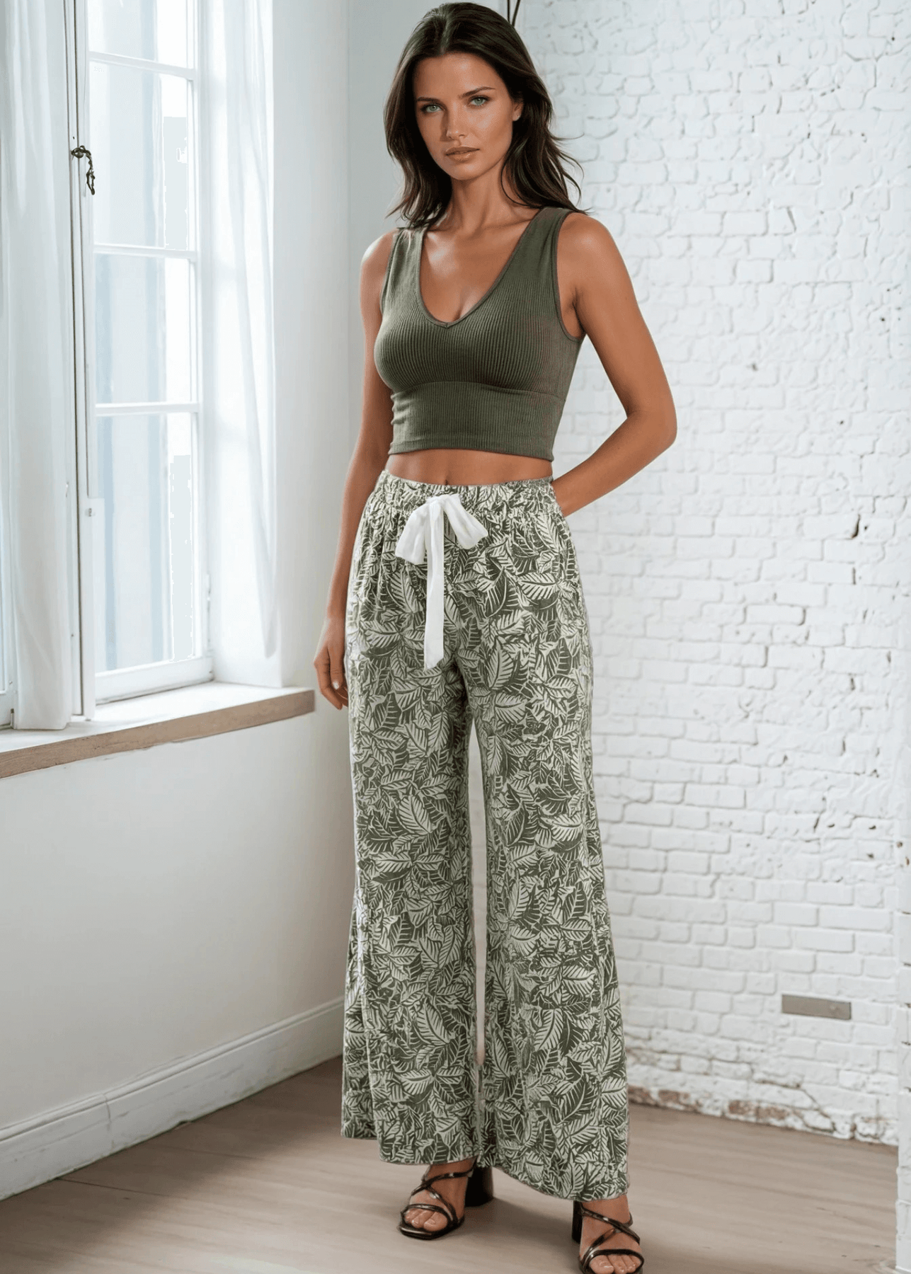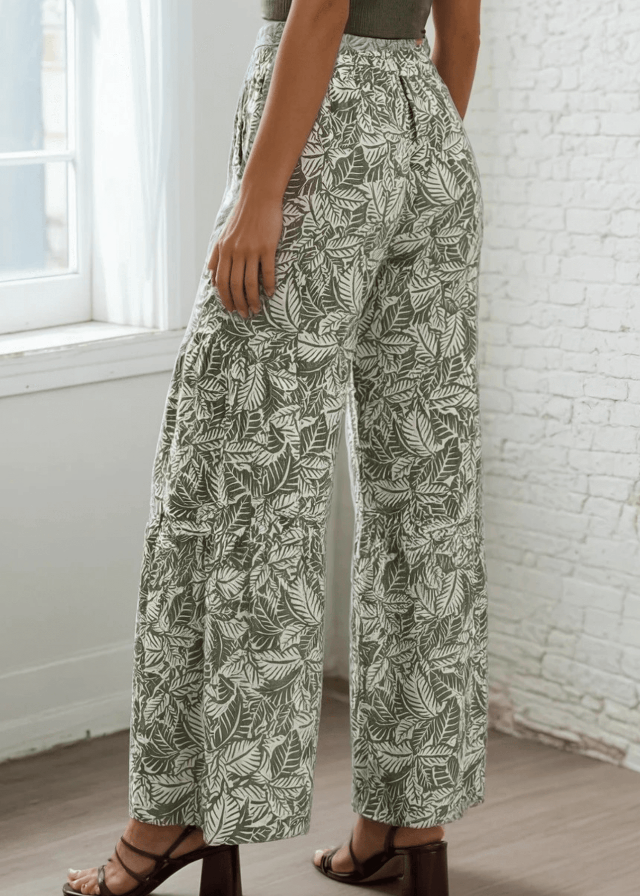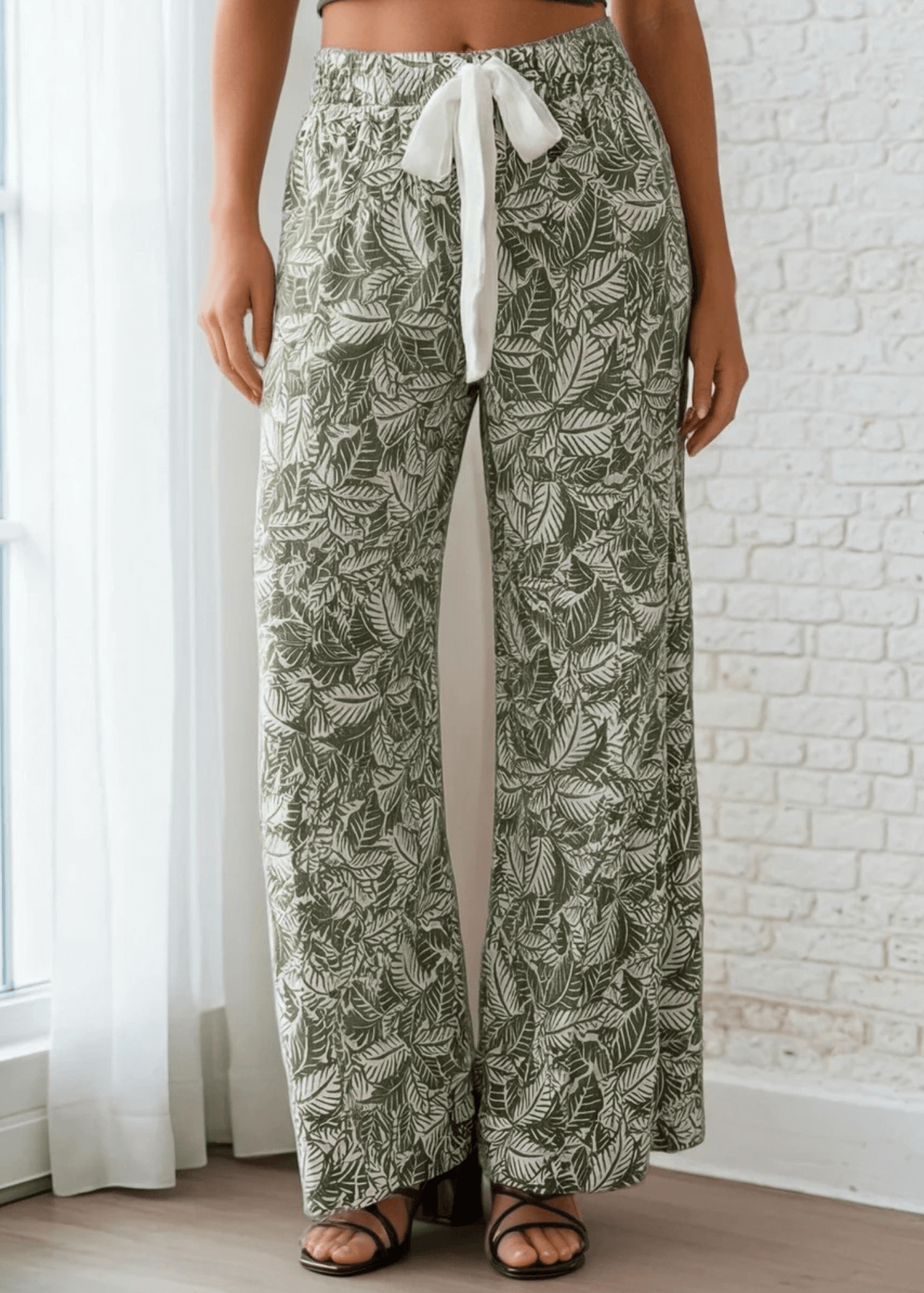 Elevate your casual wardrobe with these Molly Soft Floral Pants, featuring a striking tiered leaf print in olive and off-white. Designed for all-day comfort, they boast a super soft ribbed fabric that's lightweight and breathable. The relaxed, baggy silhouette includes an elastic waistband, contrast tie front detail, and functional side pockets for effortless style. Crafted from a durable 87% polyester and 13% spandex blend, these made-in-USA pants are easy to care for with hand wash cold and line dry instructions. Perfect for laid-back days with a polished edge.