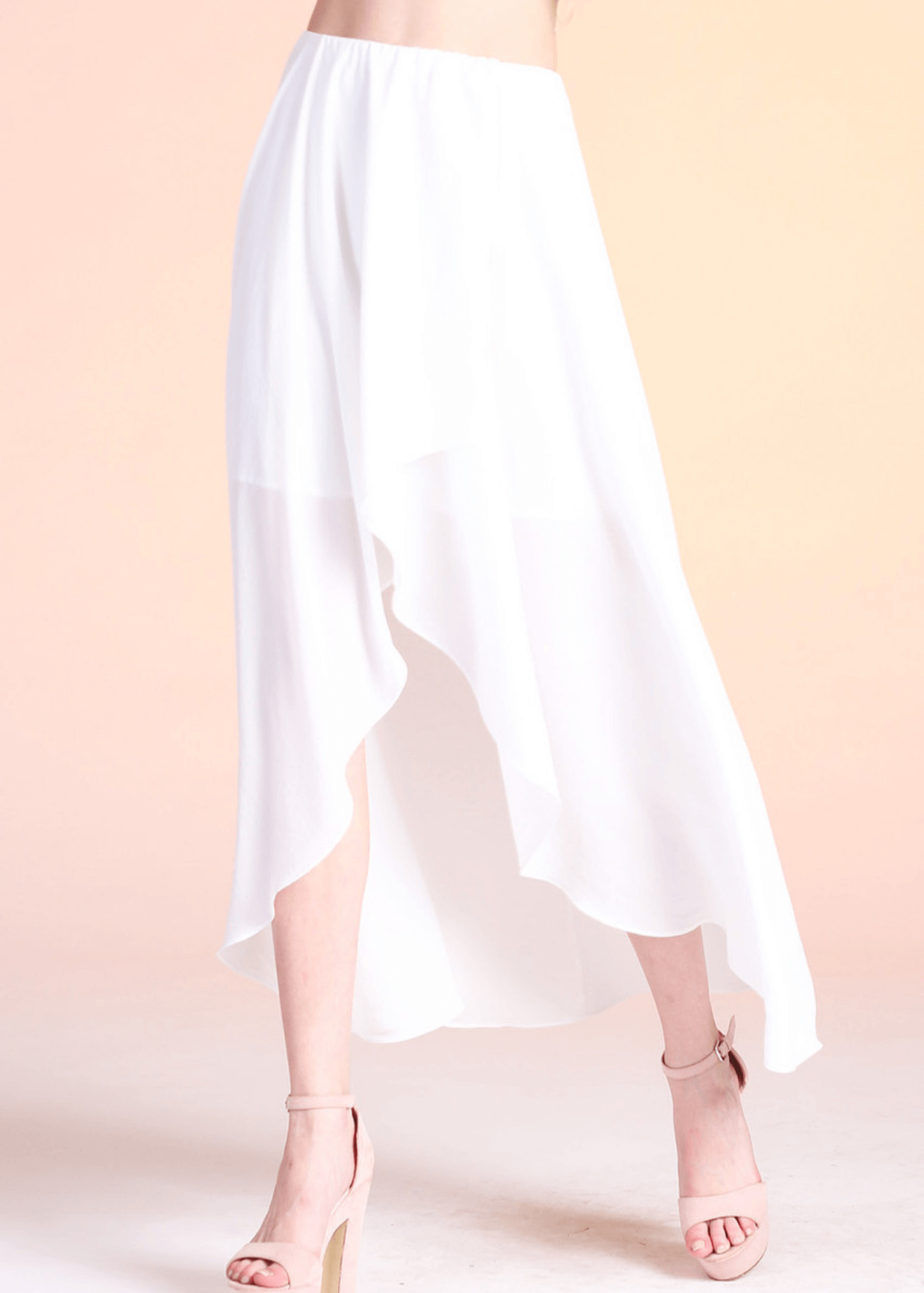 Elevate your everyday wardrobe with the Cascade High-Low Skirt—a versatile piece that transitions seamlessly from casual to refined. Crafted from soft, lightweight satin washed twill, this maxi skirt drapes beautifully with a graceful cascading silhouette and striking high-low hem that flatters every stride. The elastic waist ensures all-day comfort, while the mini lining keeps you covered. Made in the USA in a timeless ivory tone, this is the effortless staple you'll reach for again and again.
