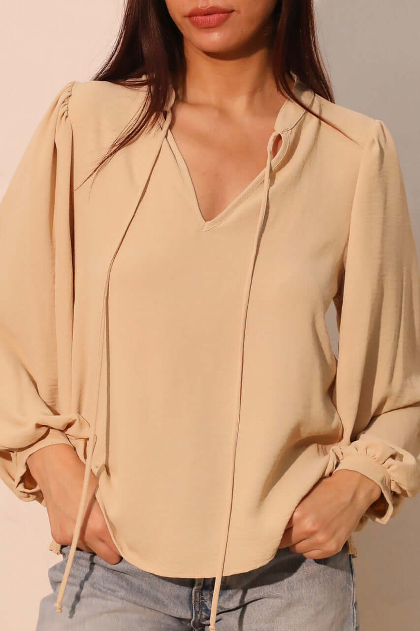 Crafted from luxurious matte crepe, this peasant top balances romantic femininity with contemporary ease. The long bubble sleeves create an elegant silhouette, while the front tie detail and V-neckline offer styling versatility. In a sophisticated champagne hue, it transitions seamlessly from daytime casual to evening sophistication. Made in the USA with quality construction that endures.