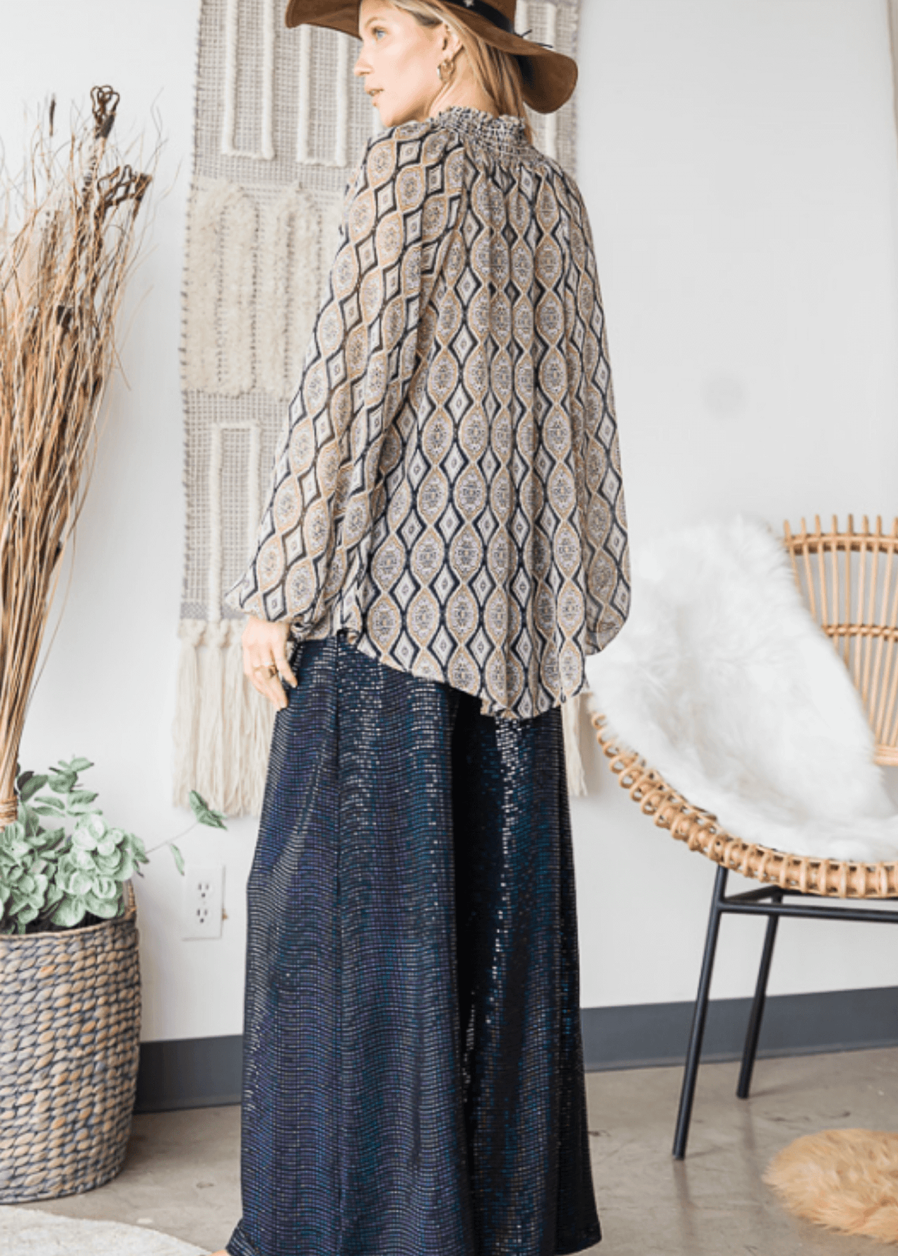 The Olivia Sheer Mock Stand Collar Blouse combines elegant design with lightweight comfort. Crafted from delicate chiffon in a taupe and black geometric print, it features a smocked high collar with a subtle split neckline for refined detail. Long puff sleeves with elasticized cuffs create a soft, graceful shape, complemented by a loose fit and curved hem for effortless sophistication. Made in the USA, this blouse is perfect for elevating any ensemble with a touch of modern elegance.