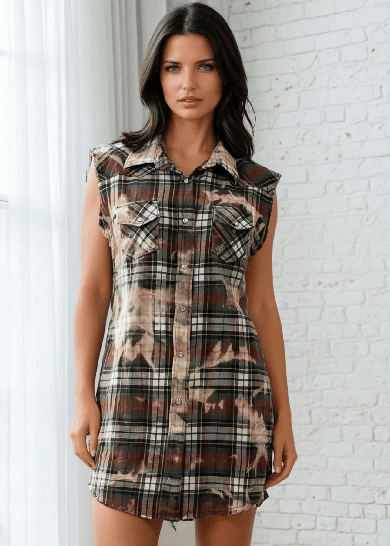Meet The Sedona Sunset Flannel Tunic - a sleeveless, boho-chic essential designed for effortless layering and laid-back luxury. Crafted in Los Angeles from ultra-soft, vintage-washed plaid, this one-of-a-kind piece features hand-bleached details, raw frayed edges, and classic chest pockets for a relaxed yet elevated vibe. Its tunic length makes it versatile enough to wear open over denim shorts or buttoned up as a dress. Inspired by desert sunsets and free-spirited adventures, this flannel captures the perfect blend of comfort, artistry, and individuality - true to The Nu Vintage DNA.