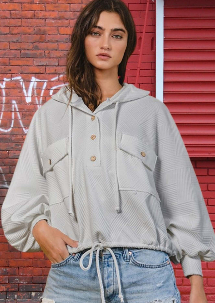 Introducing our All Seasons Textured Pullover, proudly made in the USA. This stylish hoodie features a textured knit design, a drawstring for the hood and waist, and a button up collar. With exaggerated chest pockets, raw edge detailing, and long drop shoulder puff sleeves, this relaxed fit pullover offers both comfort and unique style.