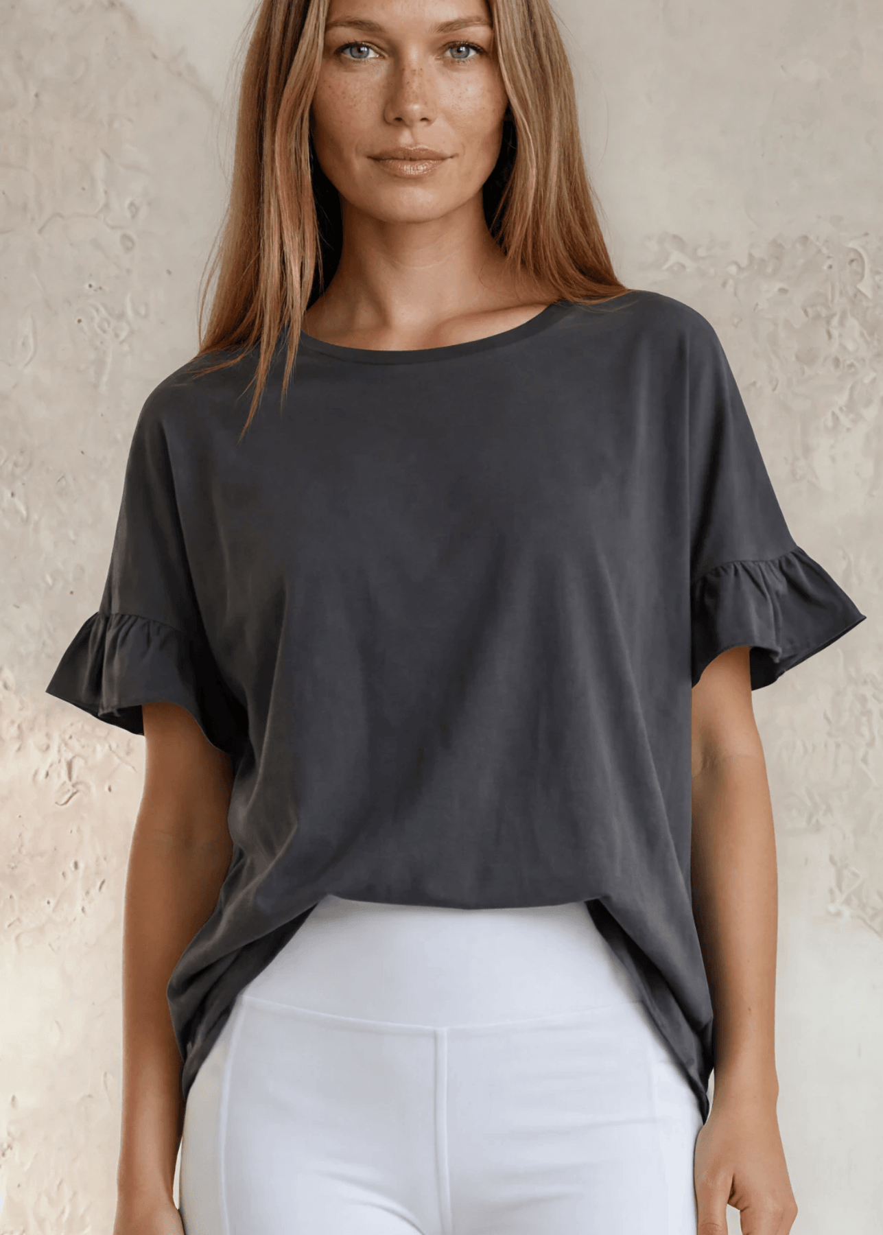 Meet your new go-to tee. The Rita Ruffled Sleeve Loose Fit Tee is crafted from premium 100% cotton with a mineral-washed finish that gives it that perfectly lived-in feel — soft from the very first wear. The relaxed, oversized silhouette drapes beautifully, while the playful ruffle sleeves add just the right amount of feminine flair. Throw it on with jeans, leggings, or your favorite shorts and you're effortlessly put together.