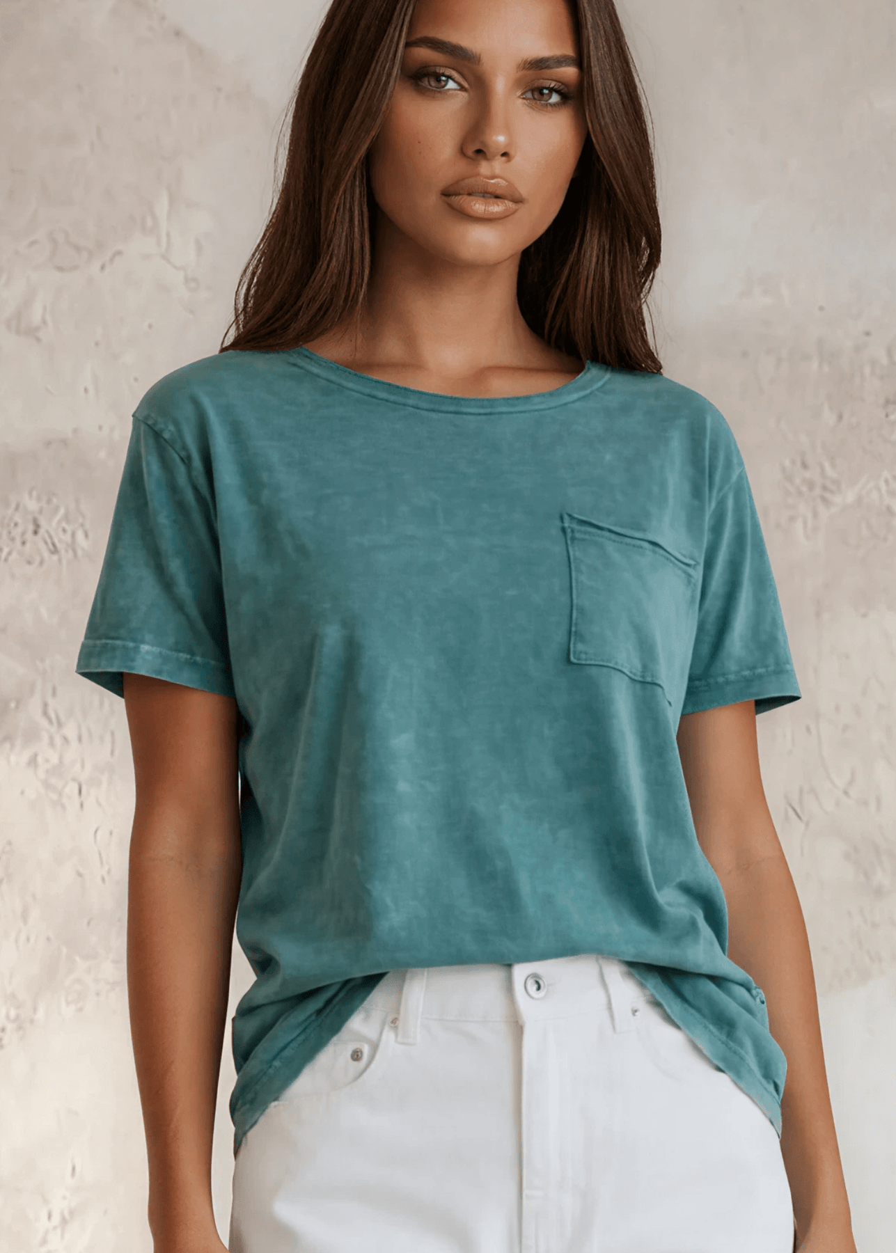 Meet the Jessie Tee in Teal — the effortlessly cool everyday essential you'll reach for again and again. Crafted from 100% cotton with a soft mineral wash and garment dye finish, this relaxed-fit tee feels like your favorite worn-in shirt from day one. The wide round neckline gives it that laid-back, lived-in vibe, while the raw edge chest pocket adds a subtle boutique touch that sets it apart from the basics.