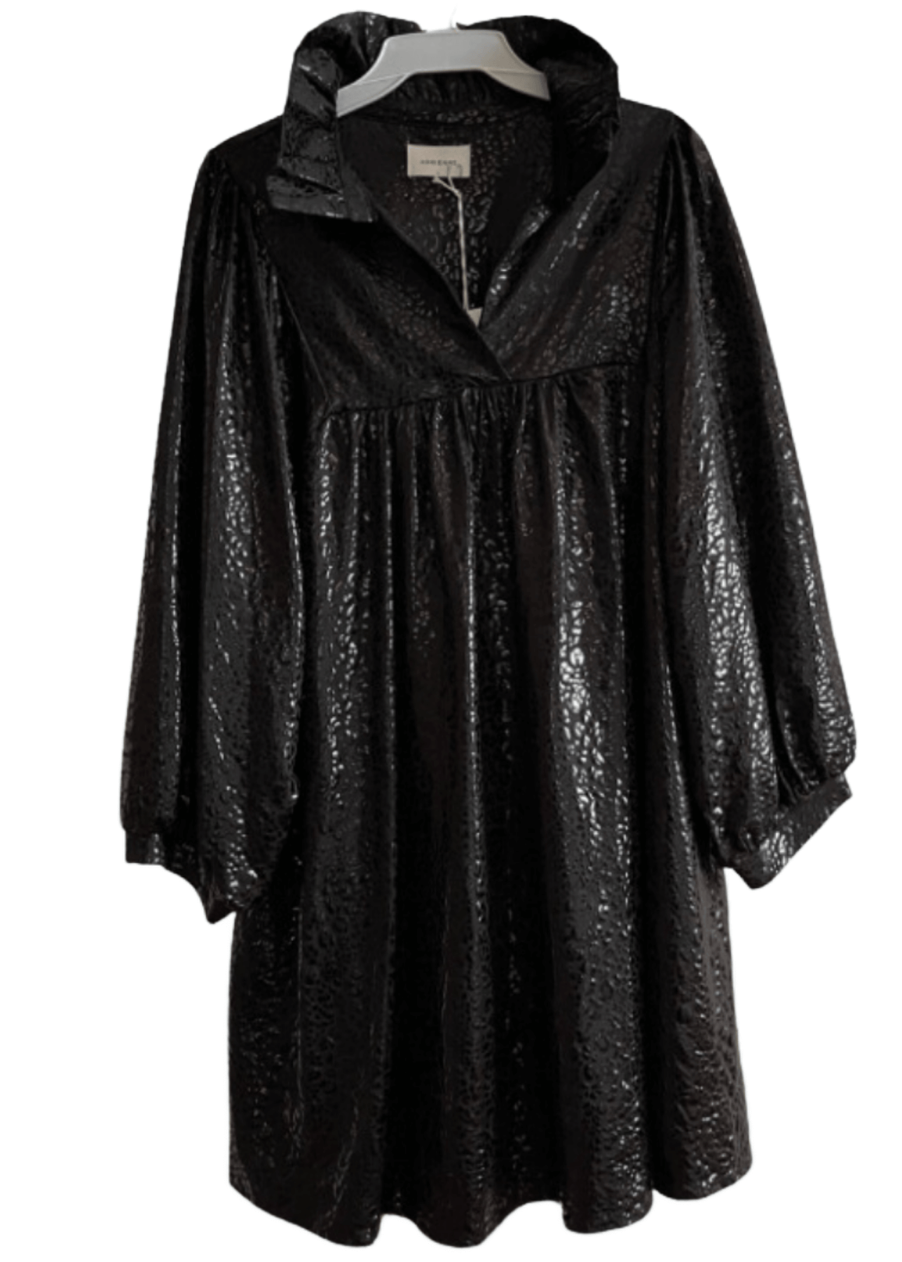 Go wild in this Black Cat Print Mini Dress! Made in the USA with faux leather and fully lined for comfort. Versatile design can be worn as a tunic or A-line dress. Features a v-neck and stand collared neckline with embossed animal print. The oversized fit adds to the playful look, while the shiny material adds a touch of sass.