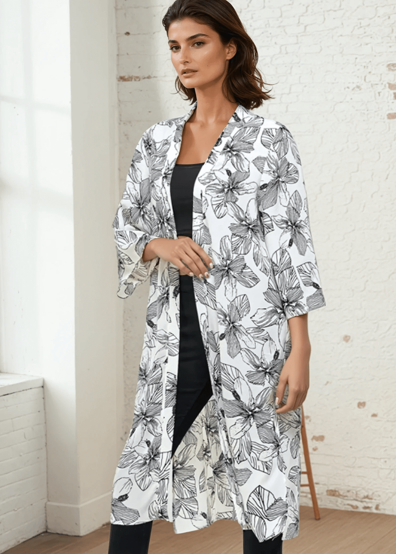 Indulge in boho vibes with the Mira Open Front Floral Kimono. Made in the USA, this lightweight and semi-sheer cardigan features a delicate white and black floral print. With a long length and side slits, it adds effortless elegance to any outfit. Made with 100% polyester wool dobby fabric, it's delicate wash and hang dry instruction ensures durability.